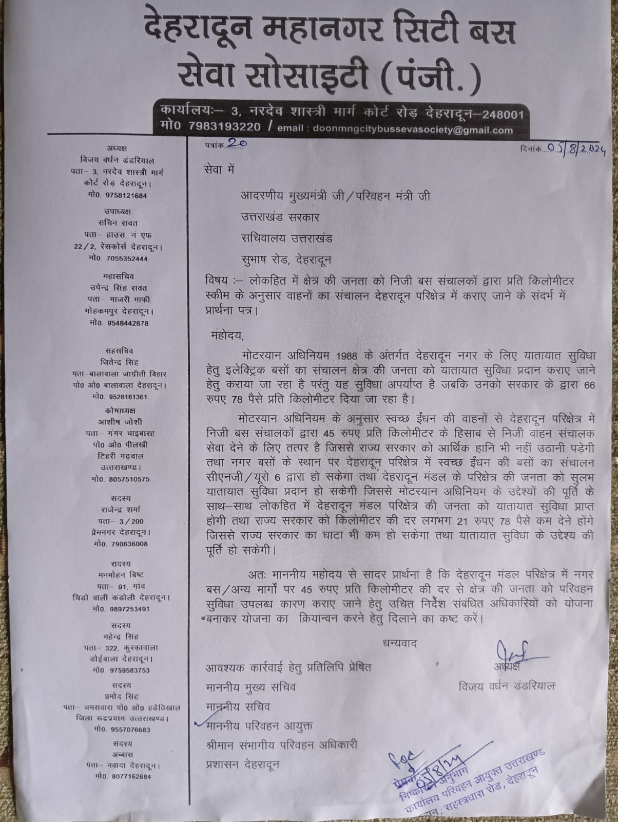 देहरादून महानगर सिटी बस यूनियन के अध्यक्ष विजयवर्धन डंडरियाल ने मुख्यमंत्री और परिवहन मंत्री के साथ देहरादून आरटीओ को एक आग्रह पत्र प्रेषित किया जिसमें कहा गया कि जिस तरह देहरादून के अंदर इलेक्ट्रिक बसों का संचालन लोगों की सुविधाओं के लिए किया जा रहा है ठीक उसी तर्ज पर निजी बस संचालक और सिटी बस संचालकों को सीएनजी और यूरो 6 के ईंधन के दरमियान संचालित करने का आग्रह स्वीकार करें।